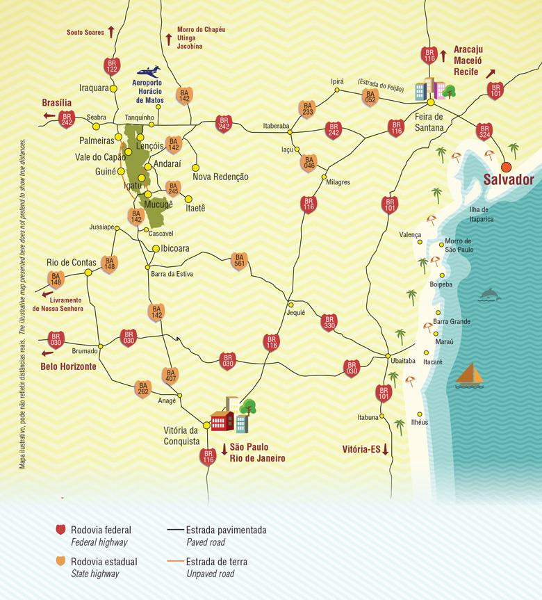 Mapa de acesso rodoviário à Chapada Diamantina. Fonte: http://www.guiachapadadiamantina.com.br/como-chegar/mapa-e-acesso/